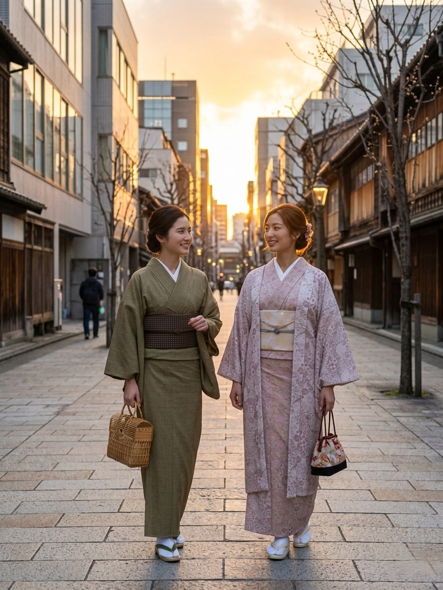 Scene 02|「春の予感。」 久々のキモノ。うまく着れた時は気持ちも一緒に整う気がする。 朝の空気が、ほんの少しだけやわらいでいる。冬の終わりのようでもあり、春の入り口のようでもある。そんな曖昧な温度。 今日は、久しぶりに会う友人と街へ出る約束。